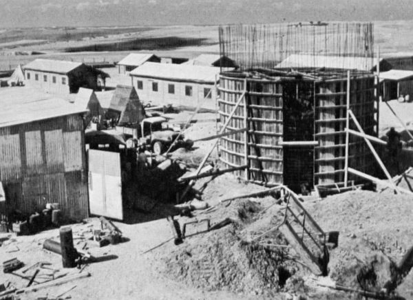 המגדל נבנה בשלושה שלבים. כשהגענו לשלב השלישי והתבניות היו מוכנות ליציקה, פרצה סערה, מלווה בפרצי רוח חזקים. כשקמנו בבוקר, לאחר שוך הסופה, ראינו שכל התבניות שינו כיוון ונטו לצד צפון-מזרח, (מכיוון שהרוח הייתה דרומית-מערבית). אינני יודע מאין לקחו כבל פלדה, הקיפו בו את התבנית ואת קצהו חיברו לטרקטור "אינטרנשיונל " (14.T.D). נדמה לי שבודא היה זה שישב על הטרקטור ומשך את התבנית לכוון דרום-מערב. אט אט, לפי הוראותיו של משה וחצי, התבנית התיישרה ויכולנו להמשיך בעבודה. אדם בעל עיניים חדות יכול להבחין עד היום באותה עקמומיות שנגרמה לבריכה, על ידי הסופה.