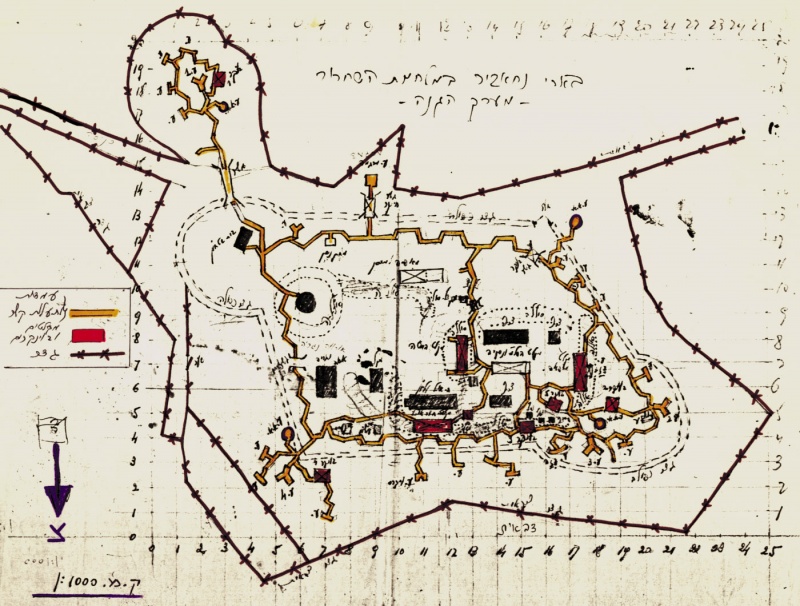 1. במרכז – נחביר. גדר תיל מקיפה 5 צריפי מגורים [עבור 4-5 בחורות וכ-25 בחורים], צריף גדול לאכילה ולמטבח. מקלחת בנויה מפחים ובסמוך לה פחון בית שימוש ו"מגדל" המים.